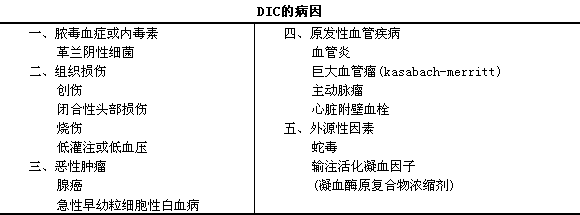 DIC的发生与许多疾病状态有关。急性和亚急性DIC最常见的原因是:i①感染(包括革兰阴性、i阳性菌,l真菌,l病毒,l立克次体,l原虫等感染);②病理产科如羊水栓塞,l胎盘早剥,l妊娠高血压等;③恶性肿瘤如白血病,l淋巴瘤等。此外,l严重创伤和组织损伤、i烧伤、i毒蛇咬伤或某些药物中毒也可引起DIC。慢性DIC主要见于恶性实体瘤、i死胎综合征、i以及进展期肝病等。1DIC的常见原因见下表。