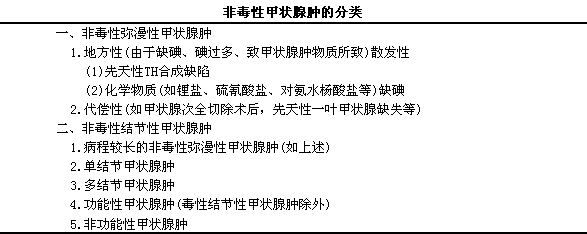 甲状腺肿(goiter)是指甲状腺的非炎症性非肿瘤性肿大。根据甲状腺功能状况可分为非毒性(nontoxic)和毒性(toxic)甲状腺肿两类,l前者的甲状腺功能正常(euthyroid),l亦称为单纯性(simple)甲状腺肿,l主要包括地方性(endemic)、i散发性(sporadic)和代偿性(compensatory)三种。当形成结节(单个或多个)后,l称为非毒性结节性甲状腺肿(nontoxic1nodular1goiter),l结节的甲状腺激素(TH)合成与分泌功能可以正常(“温”结节),l亦可降低(“冷”或“凉”结节),l见下表。如结节的TH合成与分泌功能升高(“热”结节),l即称为毒性结节性甲状腺肿(toxic1nodular1goiter)。