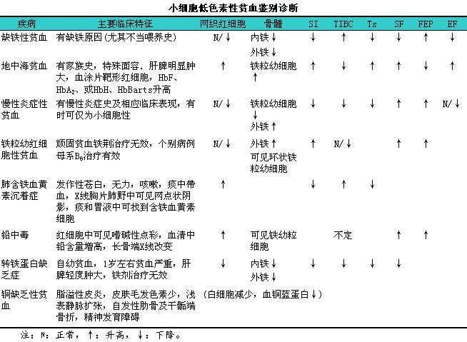 主要与各种小细胞低色素贫血的鉴别:i地中海贫血、i异常血红蛋白病、i维生素B6缺乏性贫血、i铁粒幼红细胞性贫血、i先天性无转铁蛋白血症等可表现为小细胞低色素性贫血,l可根据各病临床特点和实验室检查特征加以鉴别(下表)。