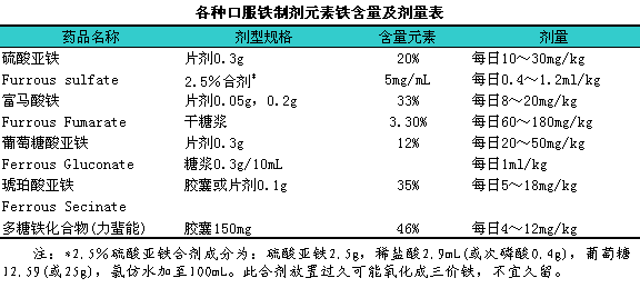 (1)口服铁剂:i铁剂是治疗缺铁性贫血的特效药,l若无特殊原因,l应采用口服法给药;二价铁盐容易吸收,l故临床均选用二价铁盐制剂。目前口服铁剂品种较多(参见下表),l但仍以硫酸亚铁最为常用,l婴幼儿则可用2.5%硫酸亚铁合剂;其他制剂如富马酸铁、i葡萄糖酸亚铁、i琥珀酸亚铁等也可采用,l但价格较贵且优点不明显。口服铁剂的剂量为元素铁每日2~6mg/kg,l分3次口服,l一次量不应超过元素铁1.5~2mg/kg。按此量可达到最高吸收率,l超过此量吸收率反而降低,l而且对胃肠道刺激作用增加。口服铁剂以饭前空腹时口服吸收较好,l但容易引起胃肠道刺激症状,l如恶心、i呕吐、i胃部不适或腹泻等;饭后服可减少上述胃肠道刺激症状,l但食物中磷化物易与铁结合成不溶解磷酸盐,l降低铁的吸收;因此,l以两餐之间口服为宜,l既可减少对胃粘膜的刺激,l又利于吸收。为减少胃肠副反应,l可从小剂量开始,l如无不良反应,l可在1~2日内加至足量。同时服用维生素C,l可使三价铁还原成二价铁,l使其易于溶解,l增加吸收。牛奶、i茶、i咖啡及抗酸药等与铁剂同服均可影响铁的吸收,l故以上食物或药物不宜与铁剂同时口服。
