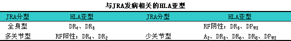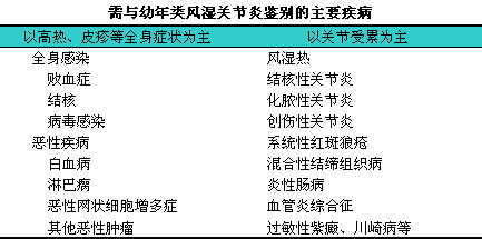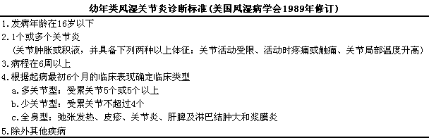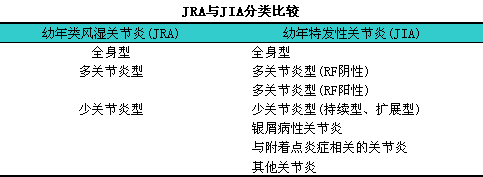 本病临床表现差异很大,l可分为不同类型,l故有许多不同命名,l如Still’s病,l幼年慢性关节炎(juvenile1chronic1arthritis,lJCA),l幼年关节炎(juvenile1arthritis,lJA)等。为了便于国际间协作,l国际风湿病学联盟将儿童时期不明原因的关节肿胀并持续6周以上的关节炎,l定名为幼年特发性关节炎(juvenile1idiopathic1arthritis,lJIA)。此分类标准将逐渐取代原有的美国应用的幼年类风湿关节炎和欧洲应用的幼年慢性关节炎这两个分类标准。由于这一新的分类标准尚在推广中,l故本书仍采用国内沿用已久的幼年类风湿关节炎这一名称。见下表。
