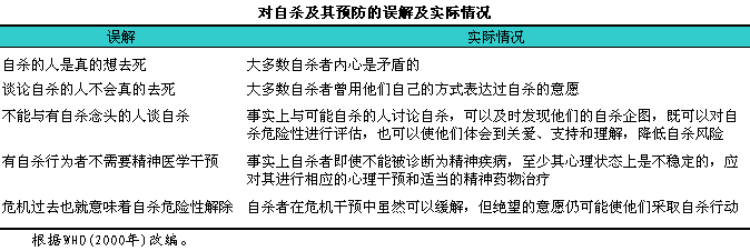 对相关患者进行自杀危险性的评估,l是预防自杀的重要一环。但是对自杀及其预防很多人存在一定的误解(见下表)。