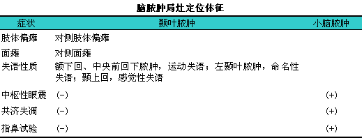 (3)局灶性症状:i视脓肿在脑部的位置不同可出现不同的定位症状(见下表)。