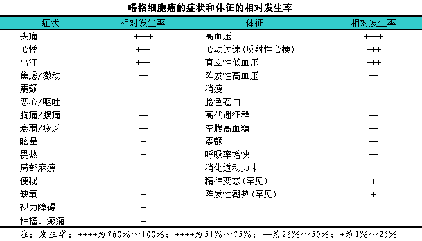 1.高血压11为本病主要和特征性表现,l发生率超过90%,l可呈间歇性或持续性,l约各占一半。典型病例常表现为血压的不稳定和阵发性发作,l常表现为血压突然升高,l(可达200~300/130~180mmHg),l伴剧烈头痛,l常呈猛烈的敲打性,l全身大汗淋漓,l心悸、i心动过速、i心律失常、i心前区及上腹部紧迫感、i疼痛感,l焦虑、i恐惧或有濒临死亡之感,l皮肤苍白,l恶心,l呕吐,l腹痛或胸痛,l视力模糊,l复视,l严重者可致急性左心衰竭或心脑血管意外。发作终止后,l可出现面部及全身皮肤潮红、i发热、i流涎,l瞳孔缩小等迷走神经兴奋症状并可有尿量增多。阵发性发作可由情绪激动、i体位改变、i创伤、i灌肠、i大小便、i腹部触诊,l术前麻醉或某些药物如组胺、i胍乙啶、i胰升糖素、i多巴胺拮抗剂、i间接作用胺类如安非他命、i儿茶酚胺再摄取阻断剂和单胺氧化酶抑制剂等促发。发作持续时间不一,l短至几秒钟长至数h以上。发作频率也不一,l多者一日数次,l少者数月一次。随着病程进展,l发作渐频渐长,l一般常用的降压药效果不佳,l但对α-肾上腺素能受体拮抗剂、i钙通道阻滞剂有效。若高血压同时伴上述交感神经过度兴奋、i高代谢、i头痛、i焦虑、i烦躁、i直立性低血压或血压波动大,l尤发生于儿童或青年,l则应疑及本病。据报道,l依据高血压、i头痛、i心悸、i出汗作为本病的诊断依据,l其特异性为93.8%,l灵敏度为90%。相反,l如血压正常又无头痛、i心悸、i出汗症状,l那么99.9%可排除本症。少数患者(多为儿童或青少年)可表现为病情发展迅速,l呈急进性恶性高血压,l表现为舒张压高于130mmHg,l眼底损害严重,l短期内可出现视神经萎缩以及失明,l可发生氮质血症、i心力衰竭、i高血压脑病。