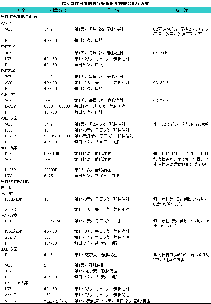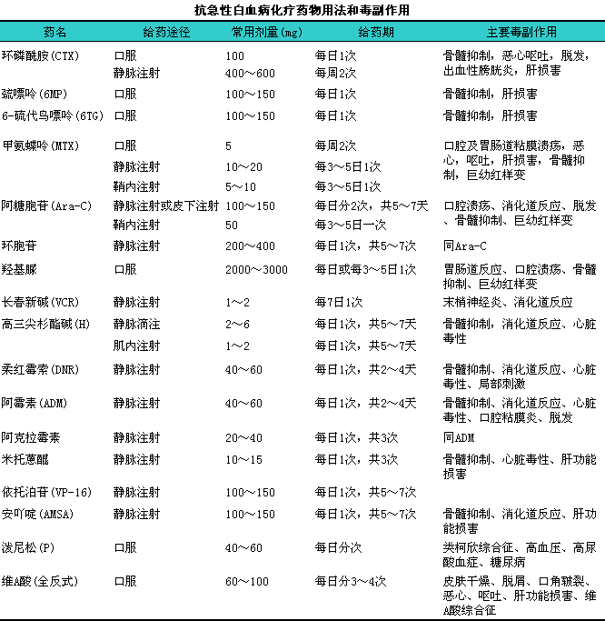 目前主要采用联合化疗治疗急性白血病。目前常用的化疗药物及联合化疗方案参阅下表。其剂量均为推荐参考剂量。