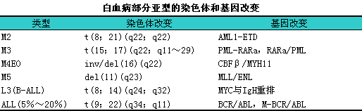 近年来,l随着分子生物学及细胞遗传学研究的进展,l人们对急性白血病发生的分子机制有了深入的认识,l发现了一些特异的、i与疾病诊断和预后密切相关的基因改变。因而建议有条件的实验室采用形态学(morphology)、i免疫学(immunology)、i细胞遗传学(cytogenetics)和分子遗传学(molecular1genetics)结合的分型,l即MICM分型。2001年,lWHO根据近年来白血病研究进展,l按照急性白血病中存在的染色体变化,l结合细胞形态学观察,l对急性白血病做了如下分类:i