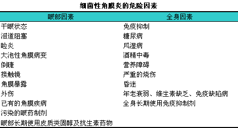 细菌性角膜炎的诱发因素包括眼局部因素及全身因素(见下表)。多为角膜外伤后感染或剔除角膜异物后感染所致,l特别与无菌操作不严格,l滴用污染的表面麻醉剂及荧光素等有关。但是一些局部乃至全身疾病如干眼症、i慢性泪囊炎、i配戴角膜接触镜、i糖尿病、i免疫缺陷、i酗酒等,l也可降低机体对致病菌的抵抗力,l或造成角膜对细菌易感性增加。