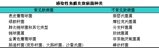 可引起角膜炎的细菌种类繁多(见下表),l但最常见的有四组:i细球菌科(葡萄球菌,l细球菌等),l链球菌科,l假单胞菌科,l肠杆菌科(枸橼酸杆菌属,l克雷伯氏杆菌属,l肠杆菌属,l变性杆菌属,l沙雷氏菌属等),l87%的细菌性角膜炎是由这四类细菌引起。