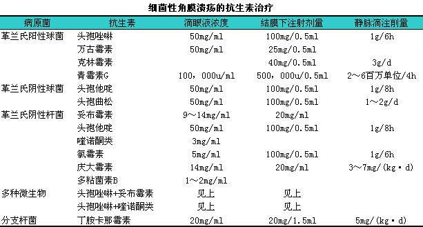 细菌性角膜炎对角膜组织可造成严重损害,l因此临床上对疑似细菌性角膜炎患者应给予积极治疗。初诊的细菌性角膜炎患者可以根据临床表现,l溃疡严重程度给予广谱抗生素治疗,l然后再根据细菌培养+药敏试验等实验室检查结果,l调整使用敏感抗生素,l常用抗生素使用浓度见下表。抗生素治疗目的在于清除病原菌,l目前没有一种抗生素能对所有细菌起作用,l因此使用广谱抗生素在初诊病例中有较大意义。80年代细菌性角膜炎首选用药是5%头孢芙新(Cefuroxime)+1.5%庆大霉素(Gentamycin),l1993年以后改为使用0.3%氧氟沙星(Ofloxacin)。近年来欧美国家推荐使用5%头孢唑啉(Cefazolin)+1.3%~1.5%妥布霉素(Tobramycin)或头孢唑啉+氟喹诺酮类。头孢霉素是针对病原体未明的Gram's阳性菌感染进行治疗的首选药物。50mg/ml头孢唑啉是代表药物。Gram's阴性菌角膜炎首选抗生素是氨基糖甙类。氟喹诺酮类(Fluoroquinodone),l对Gram's阴性菌和许多Gram's阳性菌都有抗菌作用,l尤其对耐药葡萄球菌也有作用。链球菌属,l淋球菌属引起的角膜炎首选青霉素G(PenicillinG)100,l000μ/ml,l对于耐药的淋球菌感染可使用头胞三嗪(菌必治Ceftriaxone)。万古霉素对Gram's阳性球菌有良好的杀灭作用,l尤其对耐药的表皮葡萄球菌和金黄色葡萄球菌如耐甲氧西林的菌株(methicillin1resistant1S1aureus,lMRSA和methicillin1resistant1S1epidermidls,lMRSE)的敏感性较高,l可作严重的难治性细菌性角膜炎的二线用药。