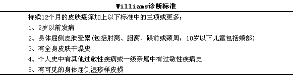 【诊断和鉴别诊断】1婴儿期和儿童期皮损多见于面部和肘窝、i腘窝等处,l呈红斑、i丘疹、i丘疱疹、i渗出、i糜烂等多形性皮损;青年成人期皮损常表现为肢体屈侧或伸侧的苔藓样变,l且呈慢陛复发性经过,l结合患者本人及其家族中有遗传过敏史(哮喘、i过敏性鼻炎,l特应性皮炎)、i嗜酸性粒细胞增高和血清IgE升高等特点应考虑本病的可能。目前国际上常用的特应性皮炎诊断标准为Williams1994年制定的标准(见下表)。