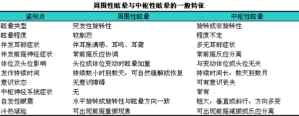 1.根据周围性眩晕与中枢性眩晕的一般特征鉴别(见下表)
