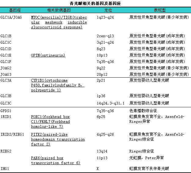 3.青光眼的相关基因研究11青光眼的家族聚集性早已被临床所关注,l大量的家系调查发现青光眼属于多因素疾病,l青光眼是具有遗传倾向性的眼病也已得到国内外学者的公认。目前青光眼的分子遗传学研究成为眼科学和遗传学领域的一个热点。近年来,l随着分子生物学技术的迅猛发展以及人类基因组计划的顺利实施,l青光眼相关致病基因的研究也取得了较大的进展,l先后定位并克隆了不少相关基因(见下表)。但青光眼的发病和遗传方式非常复杂,l涉及到多种基因相互作用以及基因与环境之间的相互作用。尽管已经得到一些青光眼相关致病基因,l还有许多问题亟待解决,l如基因功能特性的研究,l致病基因突变的意义,l相应编码的蛋白质空间结构和相应的功能改变,l与其他基因的相互关系,l是否引起青光眼相关的病理生理改变等等。青光眼相关致病基因的研究使我们能够从基因水平重新认识青光眼的发病机制,l有可能在临床出现青光眼特征性损害前从基因水平作出早期诊断,l对治疗效果和预后作出相应评价,l并为进一步的青光眼治疗方法革新如基因修正或导入外源性正常基因等基因治疗,l最终达到根治青光眼而奠定基础。