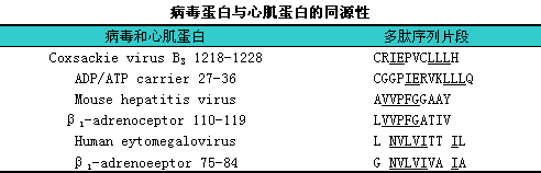 1.病毒持续感染与自身免疫反应的证据11根据分子模仿理论,l通过氨基酸序列分析,l发现ADP/ATP载体蛋白与柯萨奇B3病毒外壳蛋白有同源性;鼠肝炎病毒、i人类巨细胞病毒与β1-肾上腺素能受体之间具有相同的抗原决定簇(见下表)。通过病毒RNA探针原位杂交,l在55%受检的扩张型心肌病和病毒性心肌炎患者心肌中检测出肠病毒RNA。在扩张型心肌病和病毒性心肌炎患者血清中已发现抗心肌抗体,l如抗ADP/ATP载体抗体、i抗β1-受体抗体、i抗肌球蛋白重链抗体、i抗M2-胆碱能受体抗体。抗心肌抗体产生可能与病毒感染后诱导机体自身免疫应答有关。