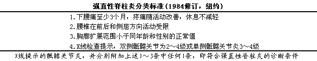 本病的诊断主要依靠病史、i临床特征及骶髂关节的X线检查。典型的病例不难作出诊断,l但对不典型的患者需注意与其他关节炎的鉴别。目前,l多采用1984年修订的强直性脊柱炎纽约分类标准提示诊断(见下表)。