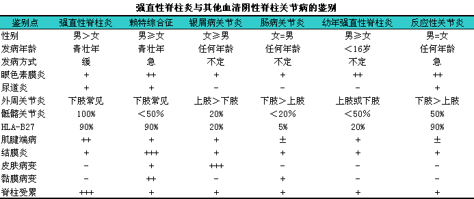 1.其他血清阴性脊柱关节病11本病与其他血清阴性脊柱关节病在临床症状、i体征及实验室检查上均各有其特点,l应根据患者的发病年龄、i诱发因素、i关节炎特点及伴随表现等综合分析进行鉴别(见下表)。