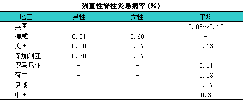 强直性脊柱炎以男性多见。本病患者的HLA-B27携带率与种族有关。我国强直性脊柱炎患者的HLA-B27阳性率达90%,l欧洲和北美白人患者HLA-B27阳性率为71%~100%,l美国黑人HLA-B27阳性率为48%,lHLA-B27阳性者发病的相对危险度为36。本病的患病率依种族的不同而异,l但多在0.2%~0.4%之间。我国的调查结果与国外类似(见下表)。