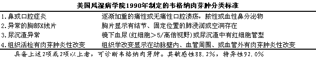 可采用美国风湿病学院1990年制定的韦格纳肉芽肿诊断标准(见下表)。