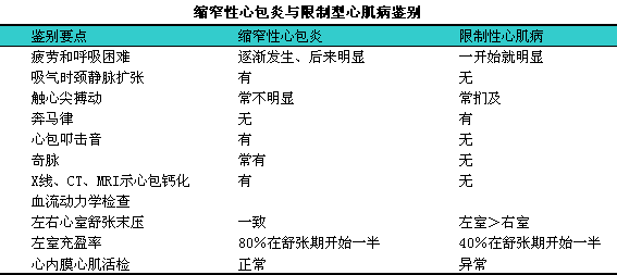 缩窄性心包炎与限制性心肌病临床表现极为相似,l鉴别甚为困难(见下表)。尚需与肝硬化、i结核性腹膜炎和其他心脏病引起的心力衰竭相鉴别。