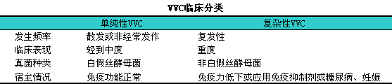 由于患者的流行情况、i临床表现轻重不一,l感染的假丝酵母菌菌株、i宿主情况不同,l对治疗的反应有差别。为利于治疗及比较治疗效果,l目前将外阴阴道假丝酵母菌病分为单纯性外阴阴道假丝酵母菌病(uncomplicated1VVC)及复杂性外阴阴道假丝酵母菌病(complicated1VVC),l见下表。