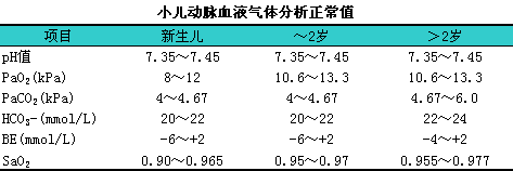 2.血气分析11可了解氧饱和度和血液酸碱平衡状态,l为诊断治疗提供依据。小儿动脉血液气体分析正常值见下表。