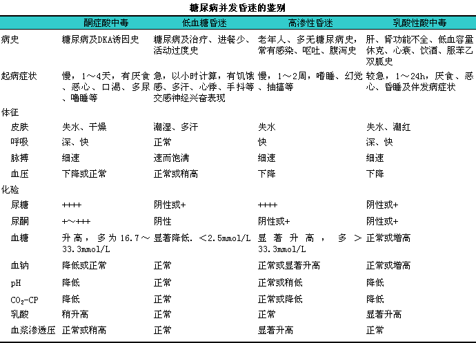 DKA的诊断并不困难,l对昏迷、i酸中毒、i失水、i休克的病人,l要想到DKA的可能性,l并作相应检查,l如尿糖和酮体阳性同时血糖增高、i血pH和(或)二氧化碳结合力降低,l无论有无糖尿病病史,l都可诊断为DKA。糖尿病病人合并尿毒症、i脑血管意外等疾病时可出现酸中毒和(或)意识障碍,l这又可诱发DKA,l应注意这种共存情况。DKA病人昏迷者只占少数,l此时应与低血糖昏迷、i非酮症高渗性糖尿病昏迷及乳酸眭酸中毒相鉴别(见下表)。