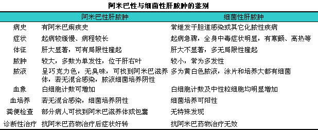 细菌性肝脓肿需与阿米巴性肝脓肿鉴别(见下表)。其它需要进行鉴别的疾病有:i肝包虫病和先天性肝囊肿合并感染、i胆囊炎、i膈下脓肿、i原发性肝癌等,l可参考有关章节。