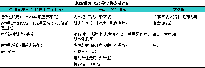 5.其他11非炎性肌病中,l遗传性肌营养不良症常有阳性家族史。多于儿童发病,l近端肌肉萎缩明显,l多伴腓肠肌等假性肥大现象。甲状腺功能亢进和减退均可并发肌病,l甲减性肌病尤可出现CK的明显增高(见下表),l其具体机制不清楚,l可能与CK清除障碍有关,l应予鉴别。其他如线粒体肌病、i糖原累积病等肌源性疾患亦须鉴别。