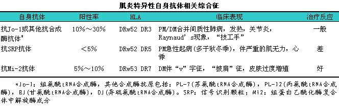 PM/DM的确切发病机制还不清楚,l普遍认为PM/DM属于自身免疫病范畴,l其证据为:i①包括肌炎特异性自身抗体(myositis-specific1autoantibodies,lMSAs)在内的一系列自身抗体的检出;②常与其他自身免疫病合并;③骨骼肌抗原免疫动物可发生炎性肌病;④PM/DM患者外周血淋巴细胞呈肌毒性,l并呈现其他免疫学异常;⑤激素等免疫抑制治疗有效。其中MSAs可分为3类(见下表):i即抗合成酶抗体,l抗非合成酶细胞浆(SRP)抗体和抗核抗原(Mi2)的抗体。抗合成酶抗体中,l抗组氨酰tRNA合成酶抗体,l即抗Jo-1抗体,l最具代表性。不同MSAs与PM/DM的临床表现类型密切相关,l如抗合成酶抗体阳性的肌炎容易合并肺间质病变等,l被称为抗合成酶综合征(anti-synthetase1syndrome)。