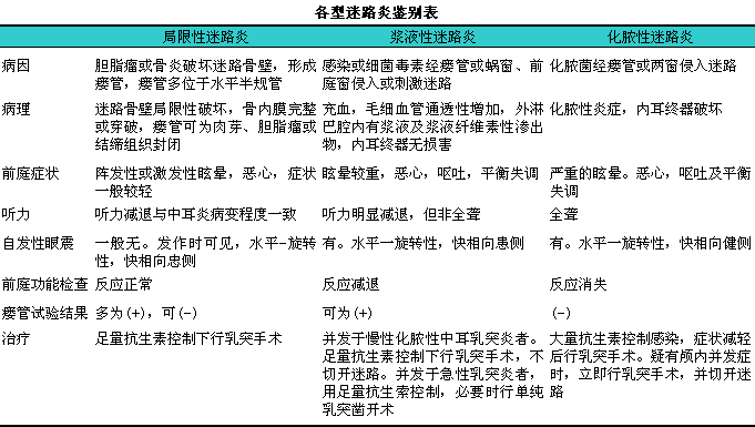迷路炎(labyrinthitis)又称内耳炎,l是化脓性中耳乳突炎较常见的并发症。中耳及乳突的内侧壁与内耳相毗邻,l中耳乳突的内侧骨壁就是内耳的骨壁,l故当中耳乳突有化脓性炎症时,l特别是骨质破坏肉芽增生的中耳乳突炎时很容易通过被炎症侵蚀的内耳骨壁引起内耳炎症发生。迷路炎可分为局限性迷路炎(亦称迷路瘘管),l浆液性迷路炎和化脓性迷路炎3个类型(见下表)。