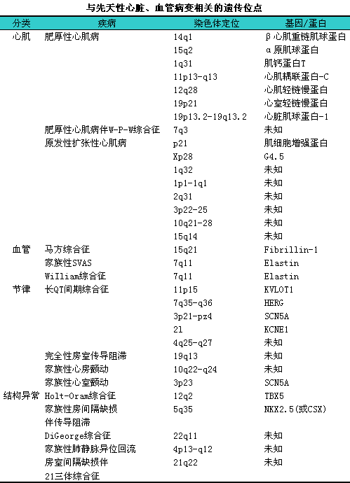 心血管畸形的发生主要由遗传和环境因素及其相互作用所致。据目前了解,l由单基因和染色体异常所导致的各类先天性心脏病约占总数的15%左右(见下表)。如:i患21三体综合征的病人,l40%合并有心血管畸形且以房室间隔缺损为最多见;13、i15和18三体综合征大多合并室间隔缺损、i房间隔缺损和动脉导管未闭等畸形;在动脉单干、i肺动脉狭窄和法洛四联症等多种畸形中80%存在第22对染色体长臂11带区缺失。主动脉瓣上狭窄可能与Elastin基因突变有关;马方综合征与Fibrillin基因有关等。但多数先天性心脏病目前仍认为由多基因和环境因素共同作用所致,l与心血管畸形相关性较强的因素主要为:i①早期宫内感染,l如风疹、i流行性感冒、i腮腺炎和柯萨奇病毒感染等;②孕母有与大剂量的放射线接触和服用药物史(抗癌药、i抗癫痫药物等);③孕妇代谢紊乱性疾病(糖尿病、i高钙血症等);④引起子宫内缺氧的慢性疾病等。⑤妊娠早期酗酒、i吸食毒品等。