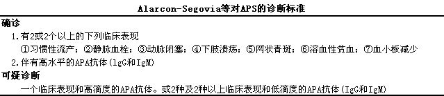APS不是一个特定的疾病,l只是一个综合表现。目前尚无非常严格的诊断标准,l多数采用Alarcon-Segovia等提出的诊断标准(下表)。确定诊断必须具备1个实验阳性指标(高滴度水平的APA)和2个或2个以上临床表现。可疑诊断必须有1个临床症状和高滴度的APA或者2个或2个以上临床症状和低滴度的APA。