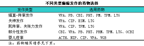 2)选药正确:i抗癫痫药物的选择主要根据发作类型,l也要考虑到药物的毒副作用、i患儿的依从性等(下表)。