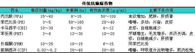 1)传统抗癫痫药物:i儿科常用的传统抗癫痫药物有苯巴比妥(PB)、i丙戊酸(VPA)、i卡马西平(CBZ)、i苯妥英(PHT)、i氯硝西泮(CZP)等(下表)。