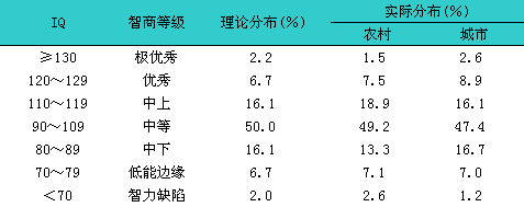 1983年我国的修订韦氏成人智力量表全国协作组分别在城市和农村抽样2000人做智力测验,l所得智商分布如下:i