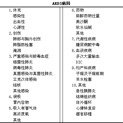 自1967年首次提出ARDS命名以来,l文献报道有关引起ARDS的病因日益增多。概括ARDS的病因分为十类列于下表。