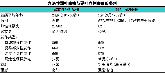 (1)家族性颞叶癫癎:i家族性颞叶癫癎是国际抗癫癎联盟新近提出的癫癎综合征。常染色体显性遗传,l外显率60%。多发生在青少年或成年早期,l部分患者有热性惊厥或热性惊厥家族史。临床表现为颞叶起源的部分性发作,l少数表现为全身强直-阵挛性发作的患者脑电图上也有提示局灶性起源的癎性放电。核磁共振多数无异常,l也没有海马硬化,l少数患者有轻度脑室扩大,l部分患者MRI检查有弥漫性点状T2高信号。连锁分析没有发现其与任何一个与颞叶癫癎或热性惊厥已知位点相连锁。以药物治疗为主,l卡马西平、i苯妥英钠、i丙戊酸都可酌情选用。下表介绍家族性颞叶癫癎与颞叶内侧癫癎的鉴别。