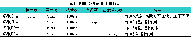 (3)冬眠低温是在神经节阻滞药物的保护下,l加用物理降温使机体处以低温状态以作为治疗的方法。冬眠低温能保护血脑屏障,l防治脑水肿;降低脑代谢率和耗氧量;保护脑细胞膜结构;减轻内源性毒性产物对脑组织的继发性损害。按低温程度可分为轻度低温(33~35℃)、i中度低温(28~32℃)、i深度低温(17~27℃)和超深低温(<16℃)。临床上一般采用轻度或中度低温,l统称为亚低温。常用的冬眠合剂及作用特点见下表。