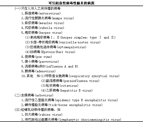 目前国内外报道有100多种病毒可引起脑炎病变(下表),l但引起急性脑炎较常见的病毒是肠道病毒、i单纯疱疹病毒、i虫媒病毒、i腺病毒、i巨细胞包涵体病毒及某些传染病病毒等。由于计划免疫的不断广泛和深入,l使得脊髓灰质炎病毒、i麻疹病毒等引起的脑炎已经少见,l腮腺炎病毒、i风疹病毒及流行性乙型脑炎病毒等引起的脑炎也大幅度地减少。