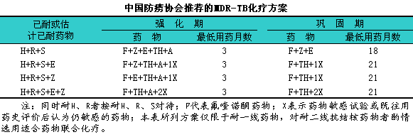 MDR-TB主要用二线药物治疗,l包括:i①氨基糖苷类:i阿米卡星(amikacin,lAKM)和卷曲霉素(capreomycin,lCPM)等;②硫胺类:i丙硫异烟胺(protionamide,l1321TH,lTBI)、i乙硫异烟胺(1314TH,lETH)等;③氟喹诺酮:i氧氟沙星(OFLX)和左氧氟沙星(LVFX)与PAS联合对杀灭吞噬细胞内结核杆菌有协同作用,l长期应用安全性及肝耐受性也较好;④环丝胺酸:i对神经系统损害大,l应用范围受限制;⑤对氨基水杨酸钠:i为抑菌药物,l可预防其他药物耐药;⑥利福布喷丁(RBT),l耐RFP菌株部分对其敏感;⑦帕星肼(异烟肼对氨基水杨酸盐,lPSNZ),l耐INH菌株中部分对其敏感。未获得(或缺乏)药敏试验结果而临床考虑MDR-TB时,l可使用方案强化期为AMK(或CPM)+TH+PZA+OFLX联合,l巩固期TH+OFLX联合。强化期3个月,l巩固期至少18个月,l总疗程超过21个月。获得约敏试验结果后,l可在上述方案基础上酌情调整,l保证3种以上敏感药物。对病变范围局限,l化疗4个月痰菌不阴转,l或只对2~3种效果较差的药物敏感,l有手术适应证者应手术治疗。常用抗结核药物及MDR-TB化疗方案见下表。