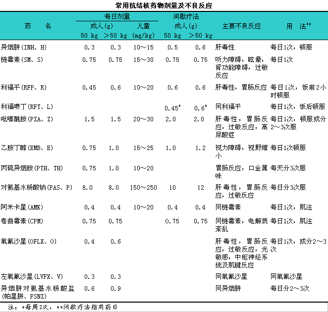 1.化学药物11常用抗结核药物10多种,l主要种类、i剂量及毒副作用见下表。常规量试管内达到结核杆菌MIC浓度10倍以上的药物为杀菌药,l常规量达不到这种浓度的药物为抑菌剂。杀菌药又分为杀菌剂与灭菌剂。杀菌剂可杀灭代谢活跃、i生长繁殖旺盛的结核杆菌,l如异烟肼(isoniazid,lINH,lH)、i利福平(rifampin,lRFP,lR)、i吡嗪酰胺(pyrazinamide,lPZA,lZ)、i链霉素(streptomycin,lSM,lS)等。INH、iRFP能杀灭细胞内外结核杆菌,l称为全价杀菌剂。只能杀灭细胞外、i碱性环境的结核杆菌(如SM),l或只能杀灭细胞内、i酸性环境的结核杆菌(如PZA)称为半价杀菌剂。灭菌剂对代谢低下、i生长繁殖迟缓菌群有杀菌作用,l如RFP、iPZA等。RFP是全价杀菌剂,l又是灭菌剂。抑菌剂有对氨基水杨酸钠(para-aminosalicylic1acid,lPAS,lP)、i乙胺丁醇(ethambutol,lEMB,lE)、i氨硫脲(TB1)、i乙硫异烟胺(ethionamide,l1314TH,lETH)等。理想抗结核药物应有杀菌或较强抑菌作用;毒性低,l不良反应少;价廉,l使用方便;口服或注射后血中达有效浓度,l并能渗入细胞内、i浆膜腔及脑脊液,l疗效迅速持久。一般首选一线药物,l如INH、iRFP、iPZA、iEMB等。联合用药是正规、i合理化疗的基础,l其作用为:i①协同作用,l提高疗效,l可同时杀灭不同酸碱环境及细胞内外结核杆菌;②延缓或避免产生耐药。