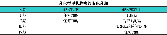 临床分期111987年国际抗癌联盟提出,l分化型(乳头状、i滤泡状)甲状腺癌病人的年龄在分期中起十分重要的作用。美国癌肿协会将分界定为诊断时年龄45岁,l二组病人的预后明显不同。(见下表)。