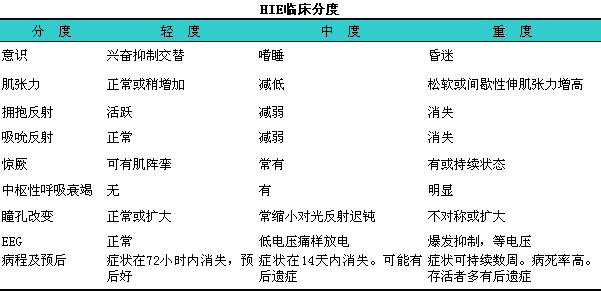 临床症状体征:i主要表现为意识障碍、i肌张力及原始反射改变、i惊厥、i脑水肿颅内高压等神经系统症状。惊厥常发生在出生24小时内,l脑水肿颅内高压在24~72小时内最明显。根据临床表现可分为轻、i中、i重度(下表)。