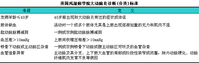 可依据美国风湿病学院(ACR)诊断(分类)标准:i符合下表中三项或三项以上者可诊断为大动脉炎见下表。
