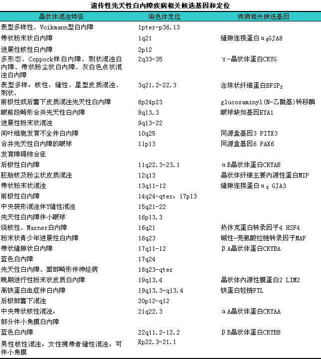 迄今为止,l已基本明确定位的先天性白内障疾病相关基因主要包括四大类(见下表):i④晶状体蛋白结构改变,l导致晶状体纤维结构和排列异常引起晶状体混浊。如αA晶状体蛋白CRYAA、iβA晶状体蛋白CRYBA、iγ-晶状体蛋白CRYG等;②晶状体内膜蛋白结构改变,l导致细胞间正常的信息传递受影响引起晶状体混浊。如缝隙连接蛋白α3GJA3、i缝隙连接蛋白α8GJA8等;③晶状体发育过程中的调控蛋白及与代谢有关的蛋白表达异常引起晶状体混浊,l导致白内障。如同源盒基因3(PITX3)、i同源盒基因6(Pax6)等;④其它,l如热休克蛋白转录因子4(HsF4)等。