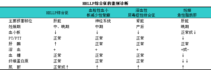 HELLP综合征与严重的子痫前期、i子痫、i溶血性尿毒症性综合征、i血栓性血小板减少性紫癜、i妊娠期急性脂肪肝的临床表现和实验室检查结果相似,l应予鉴别(下表)。HELLP综合征损害肝细胞,l引起肝酶释放增加,l而急性脂肪肝影响肝合成功能,l造成低血糖、i高氨血症及凝血时间延长。血栓性血小板减少性紫癜主要为神经系统异常,l溶血性尿毒症性综合征主要为肾功能衰竭。