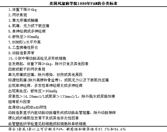 PAN作为一种少见病,l具有复杂多变的临床表现,l不易诊断。对于新发高血压的患者,l同时伴有系统性症状,l如发热、i体重下降以及关节痛,l则提示PAN诊断可能,l必要根据病变情况行活检以及血管造影等诊断。下表列出了1990年美国风湿病学院(ACR)的分类标准。