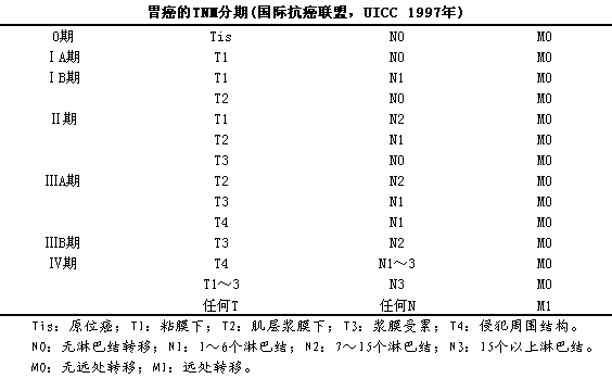 胃癌可分为早期和进展期。早期胃癌的癌组织局限于粘膜和粘膜下层,l而不论有无淋巴结转移(侵及粘膜下层者中11%~40%有局部淋巴结转移)。进展期胃癌深度超过粘膜下层,l其中侵入肌层者称为中期,l侵及浆膜或浆膜外组织者称为晚期。胃癌的TNM分期见下表。