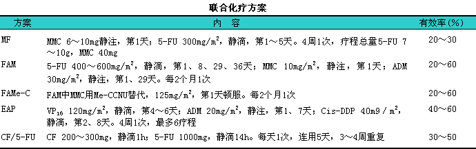 胃癌的常用化疗药物有5-氟尿嘧啶(5-fluouraeil,l5-FU)、i丝裂霉素(mitomycin,lMMC)、i阿霉素(adrimycin,lADM)、i亚硝脲类(CCNU、iMeCCNU)、i顺铂(cisplatine,lCis-DDP)和依托泊苷(Etoposide,lVP16)等。这些药物单用效果差,l联合应用稍佳。联合应用方案繁多,l目前尚无理想的配伍。亚叶酸钙(calcium1folinate,lCF)可增强5-FU的活化和细胞毒作用。联合化疗方案见下表。