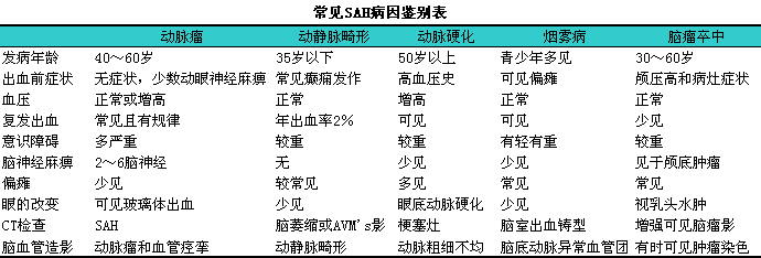 4.腰椎穿刺11用于CT检查阴性而又怀疑SAH者。颅内压增高者应慎用。常见SAH病因鉴别见下表。