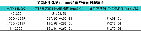 1.新生儿筛查11主要是新生儿21羟化酶缺乏症的筛查。目的是:i①预防危及生命的肾上腺皮质危象及盐皮质功能不足而导致的CAH患儿脑损伤或死亡;②预防女性患儿由于外生殖器男性化造成性别判断错误;③预防过多雄激素造成患儿日后身材矮小、i心理生理发育等障碍。方法:i生后2~5天足跟采血滴于特制滤纸片上,l经ELISA、i荧光免疫等方法测定17-OHP浓度来早期诊断。正常新生儿出生后17-OHP可增高,l至12~24小时后降至正常。判断标准参见下表。
